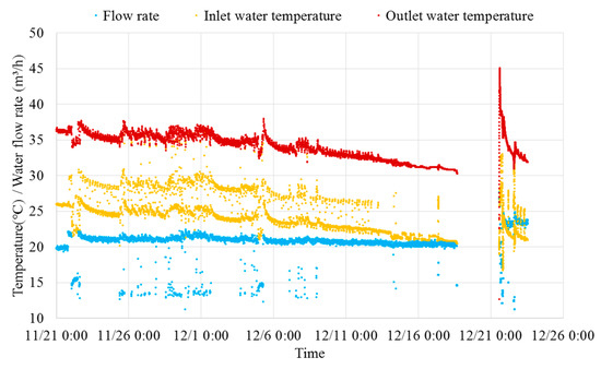 In order to check the accuracy of the model, the field test is conducted to obtain the operational data. Figure 7 then presents the field test results from 21st November to 18th December As mentioned above, 1# heat pump and 2# heat pump operate with the same heat source. However, during the operation, the heating demand in upper floor is lower than rated value with low occupancy rate, thus 1# heat pump starts and stops frequently with ground side water pump operating continuously, while 2# heat pump operates continuously. Consequently, the inlet water temperature of DBHEs rises when 1# heat pump turns off, then drops when 1# heat pump turns on, showing two different lines. Besides, when the 1# heat pump turns off for a long time, the ground side water pump would also turn off, then the flow rate of ground side drops rapidly, which also shows two different lines. With those variable operating conditions, the inlet water temperature varies from 20 °C to 34 °C and flow rate varies from 10 m3/h to 23 m3/h. Then we can see that the outlet water temperature declines from 37 °C to 30 °C and also fluctuates with the changing of inlet water temperature and flow rate. From 18th Dec to 21st Dec, the DBHE turns off then turns on again. During the turning-off period of 84 h, the ground side water continues to extract heat from the ground thus the water temperature rises gradually. Then when the DBHE turns on again, the outlet water temperature reaches 45.1 °C and drops gradually with the operation of the systems.