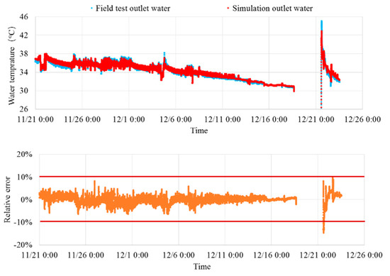 It can be seen that the simulation values nearly equal to the field test results for this transient operation mode with relative errors between −10–10%, showing that the model is accurate enough to analyze the heat transfer process of DBHEs.