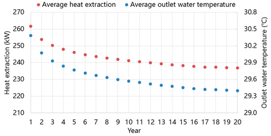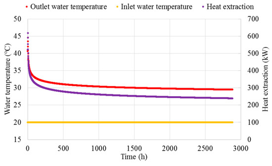 With the simulation, the continuous heat transfer performance of the DBHEs can be calculated and analyzed. Figure 9 shows the outlet water temperature, inlet water temperature and heat extraction among the heating season. With the inlet water temperature set at 20 °C and flow rate set at 6 kg/s, the outlet water temperature reaches 44.6 °C and the heat extraction reaches 619 kW at the beginning. Then with the operation of the system, the ground temperature declines gradually, thus leading to the declining of the outlet water temperature and the heat extraction. During the whole heating season, the average outlet water temperature reaches 30.4 °C and the heat extraction reaches 263.0 kW. Besides, the total heat extraction reaches 2727 GJ for one DBHE, which is higher than that of the conventional shallow-depth heat exchangers.