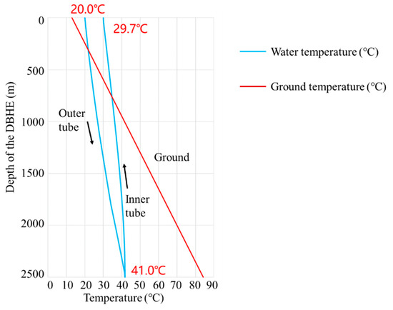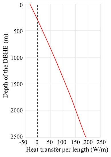 Figure 11 shows the heat transfer per unit length along the DBHE, with the increasing depth, the temperature of the ground rises, leading to the increasing of the heat transfer per unit length. The value reaches 193 W/m at the bottom of the DBHE with average value of 97.8 W/m. However, at the ground with a depth shallower than 300 m, the temperature of the outer pipe water is higher than that of ground, thus the heat is transferred from the outer pipe water to the ground. Therefore, for the optimization of outer pipe, more works should be done to enhance the heat transfer performance in deep part but for the shallow part, the insulation performance should be enhanced instead to decrease the heat loss.