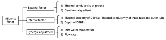 In order to optimize the system design and control strategies of DBHEs, the influence factors of heat transfer performance should be analyzed and studied. As shown in Figure 12, the influence factors could be classified into 3 categories: (1) External factors for the geothermal properties, including thermal conductivity of ground and geothermal gradient;( 2) Internal factors for the DBHEs, including the thermal property and depth of DBHEs; (3) Synergic adjustment for operation during the heating season, including the adjustment of inlet water temperature and flow rate, which are field tested to be key factor influencing the heat transfer performance of DBHEs [13].