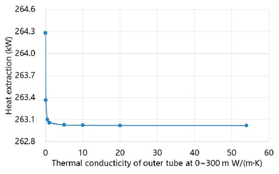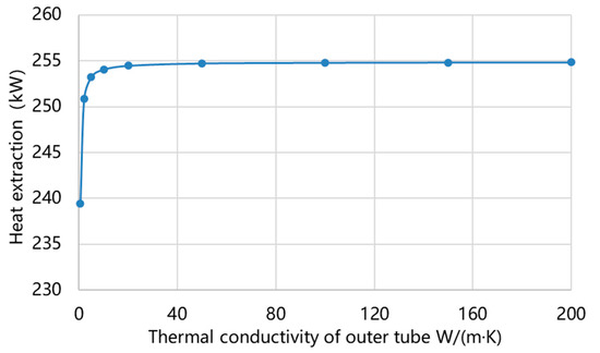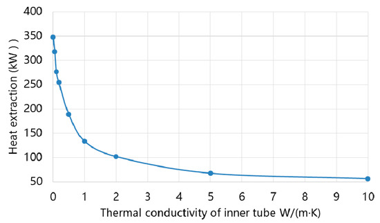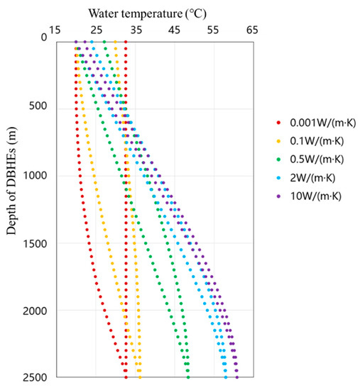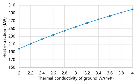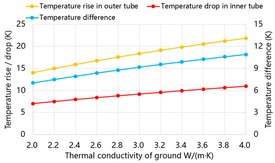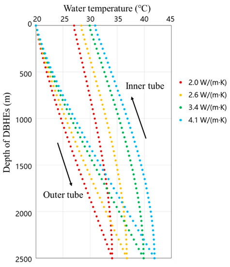 With the inlet water temperature set as 20 °C and the flow rate set as 6 kg/s, Figure 13 shows the water temperature distribution in DBHEs at the end of heating season under different ground thermal conductivity. It can be seen that with the increasing of ground thermal conductivity, the heat transfer between outer pipe water and the ground is enhanced, thus the temperature rise of outer pipe water increases obviously. However, the temperature difference between inner pipe water and outer pipe water increases at the same time, thus more heat is lost from inner pipe water to the outer pipe water, leading to increasing of temperature drops of inner pipe water. As shown in Figure 14, since the outer pipe water temperature rises more than the water temperature drops in the inner pipe, the temperature difference between outlet water and inlet water increases, leading to the increasing of average heat extraction during the heating season (Figure 15).