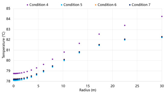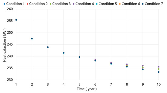It can be seen that, at the early stage, there is no obvious difference in heat extraction between those 7 different boundary conditions. However, since the 6th year, the difference becomes obvious gradually. Then at the end of 10-years operation, the annual average heat extraction of DBHE under condition 4 is the highest among those 7 different conditions. Then comes to the heat extraction under conditions 1–3 with nearly the same values. And the heat extraction under conditions 5–7 with nearly the same values are the lowest. The results show that the boundary condition of radial far boundary has more influence on heat transfer performance than boundary condition at bottom. As for the radial far boundary, if the radius of boundary is long enough, like 100 m or more, there is no obvious difference in the heat extraction between isothermal condition and adiabatic condition. However, in the practical project, there are more than one DBHE operating in parallel and the distance between adjacent DBHEs are lower than 50 m under the limit of space. Under this situation, the adiabatic condition is preferable.