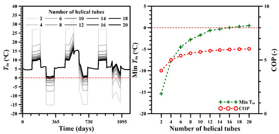 - Zheng, W.; Zhang, H.; You, S.; Ye, T. Numerical and experimental investigation of a helical coil heat exchanger for seawater-source heat pump in cold region. Int. J. Heat Mass Transf. 2016, 96, 1–10. [Google Scholar] [CrossRef]