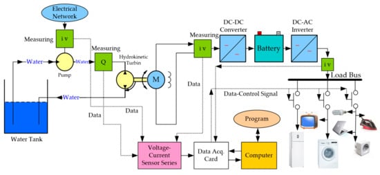 The whole experimental set up consists of a vertical axis hydrokinetic turbine with fixed rotating blades, speed increasing mechanism, DC generator, rectifier, battery bank and inverter. The data was transferred to the computer via sensors and data transfer card. The principle view of whole system is given in Figure 1 [5].
