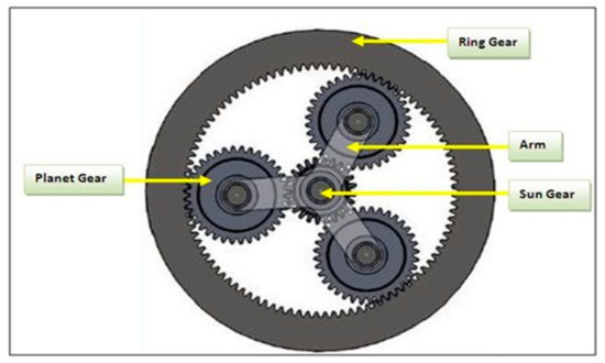 Vertical axis hydrokinetic turbines with straight blades expose low coefficient of power (Cp) with respect of tip speed ratio (TSR) [26]. Low flow rates such as 1.1–1.3 m/s may cause the generator to rotate at low speeds or even fail to generate electricity. In order to avoid these negative effects, a gear mechanism is installed at the input of the generator. This mechanism triples the rotation speed in the form of a gearbox before the generator. Figure 4 shows the principle of gearbox mechanism of the DC generator.