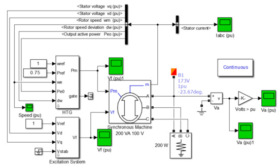Since the optimization of the system is a time-consuming process, the real model of the experimental setup is examined through numerical analyzes. The system is modeled in MATLAB SimElectrics environment for the process of optimizing experimental setup. All elements of the system are created in SimElectrics using MATLAB models. The main purpose of this stage is to provide the improvement and development requirements in the experimental setup before the experiments begin. Figure 5 shows the MATLAB/Simulink circuit with the parameters of the experimental system. The synchronous generator that converts the mechanical power of the turbine to electrical energy and produces an output power in the range of 200–210 W is used in the circuit. The turbine control system generates the necessary signals to the excitation system of the turbine according to the speed and power references given based on fuzzy logic.