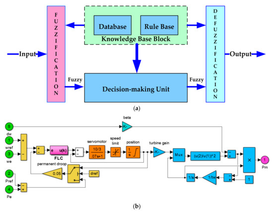 (a) Basic configuration of a fuzzy logic control; (b) fuzzy logic based turbine control system.