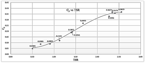 Coefficient of power (Cp) vs. tip speed ratio (TSR).