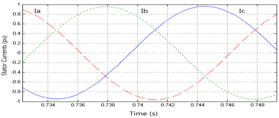 MATLAB/Simulink analysis results from turbine control system based on fuzzy logic are given in this section. According to the data obtained from the analysis, the variation of generator winding currents over time is shown in Figure 9. The generator has a maximum amplitude of 1 pu per phase.