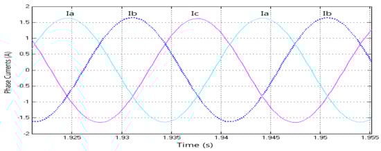 Figure 10 shows the phase currents of the load connected to the generator output obtained from the analysis results. The maximum value of the currents has an amplitude of about 1.7 (A). The current obtained here is equal to 1 pu of current obtained from the stator and verifies the system operation.