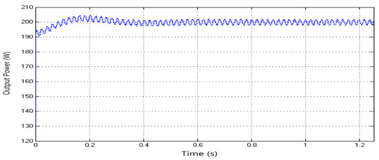 The instantaneous output power of the system is approximately 200 W that can be seen in Figure 11. As given in the data section of the experiments, 214 W power was obtained from the system, which indicates the compatibility of the experimental results with MATLAB/Simulink results. When the graph in Figure 12 is examined, there is a fluctuation in the power output at the beginning of the analysis but after a period of one second it reaches a stable and narrow amplitude.