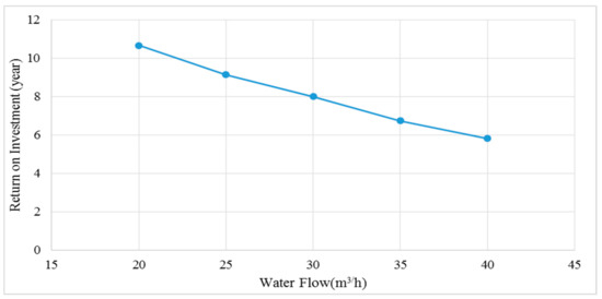 If the consumption the house is more than our average calculation than there is a need for a higher flow rate resource. The electric power to be generated for higher flow flows was calculated using the experimental set and MATLAB Simulink. Because of the increase in power generation, the return on investment of the system is further reduced. In Figure 13, the relationship between water flow and time for meeting the investment cost is given.