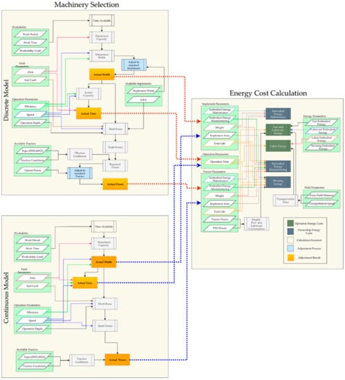 In order to calculate the energy cost of performing an agricultural operation, the model presented in Figure 2 was used. The calculation consists of two distinct stages, namely the machinery selection and the calculation of the energy costs. For the machinery selection stage, in order to estimate the effect of standardized machinery on the overall energy consumption, two models were considered, namely the continuous and the discrete model, while the energy cost calculation is the same for both models. The continuous model calculates the energy consumption of a theoretical machine system without correction to standard commercial machinery, while the discrete model considers the commercially available implements and tractors for the determination of the energy costs. More specifically, the necessary machine system (single or multiple if it is required) to perform the operation is automatically calculated by the model, considering both operational parameters and the machinery available. The calculation process of the discrete model is presented in detail below, however, the basic equations are standard for both models. Nevertheless, it should be highlighted that, in the continuous model, only a single machine system is considered.