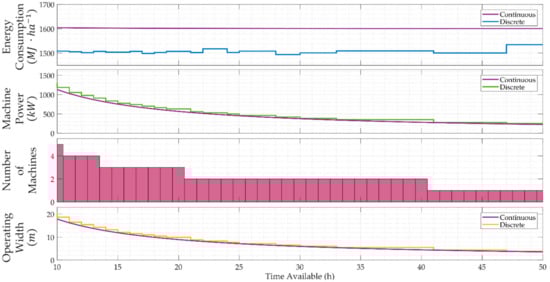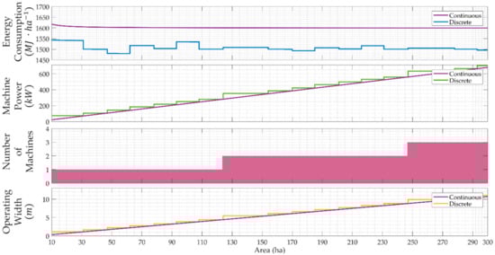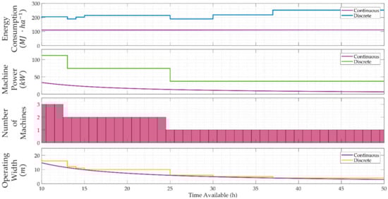 The required width and power to complete the operation on time do not differ significantly between the discrete and the continuous model. This can be attributed to the large energy requirements of the operation, as well as to the availability of implements. In the case of the moldboard plow, the commercially available width of the implements presented more subdivisions in the range of 1.1–4.4 m, providing the tool with more options during the machinery selection stage.
