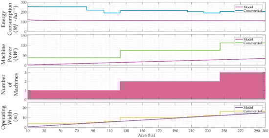Figure 8 presents the evolution of the model with respect to the field area, considering time available of 50 h. For field areas up to 30 ha, the operation can be performed with one tractor carrying the minimum available implement (1.1 m). From this point, the implement width is further increased until it reaches the maximum available of 4.4 m. Then, with a further increase in the area, a second machine is needed to perform the operation timely. The width and power increasing pattern is the same for the second machinery as previously described until the point when a third machine is required. The average energy cost, in the case of 50 h of available time, is 1508.61.