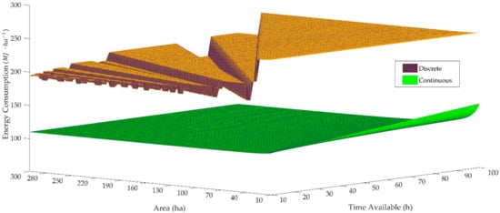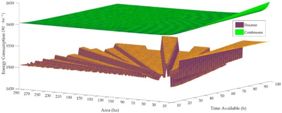 The total energy consumption of the discrete and continuous model for moldboard plowing in a wide range of area and available time is presented in Figure 9. The continuous model has an average energy cost of 1604.95, which is 1.06 times higher than the discrete model, which presents an average energy cost per hectare of 1510.37. This finding highlights the importance of time when performing an agricultural operation of high operation energy requirements. For moldboard plowing, 90.4% of the energy consumed is attributed to operation, while only 9.6% of the energy consumed refers to the energy ownership costs. As a consequence, the adjustment to the closest bigger available implement resulted in a reduction of the total energy, as the actual time required to perform the operation decreased with the increased implements’ width.