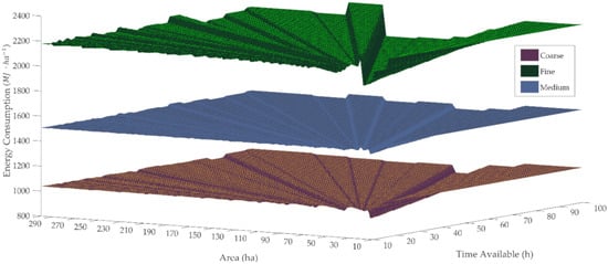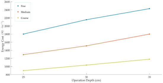 Another factor that was examined was the sensitivity of the energy consumed with respect to the type of soil and the operation depth. In that end, the calculations were performed for different depths (plus 5 cm and minus 5 cm from the original example), as presented in Figure 10, and soil types (fine and coarse in addition to medium soil), as presented in Figure 11. For the field cultivator, it was found that the operation depth and the type of soil do not affect the total energy consumed in the case of the discrete model. This is attributed to the fact that the minimum available commercial machinery covers the requirements of the operation, irrespective of the type of soil or the depth.