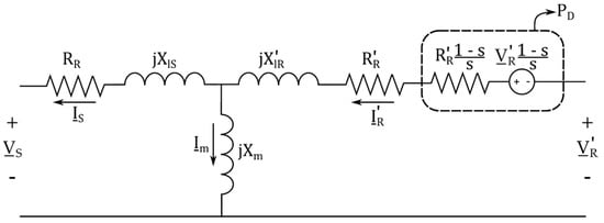 where, and are the stator resistance and reactance, respectively; is the slip; and are the rotor resistance and reactance referred to the stator, respectively; and is the magnetizing reactance. The parameters and are defined as