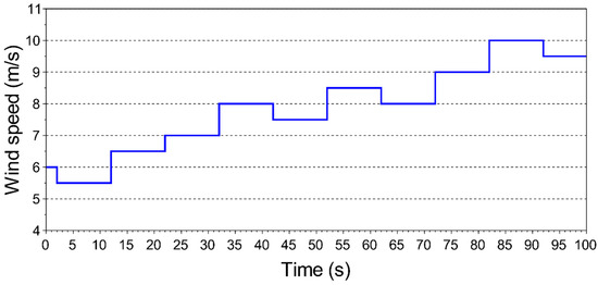 The DFIG RSC control methodology proposed in this article was analyzed by applying wind speed steps, as shown in Figure 4. This wind profile was adopted with the intention of demonstrating the effectiveness of the proposed method in low and high wind speeds, as well as near zero slip. The wind speed ranging from 5.5 to 10.0 m/s was adopted to respect the generator speed limits presented in Table 2, corresponding to a slip range of 30% to −30%, approximately. In order to ensure that the control assumptions are respected, the convergence of velocity to its reference value should be analyzed, as well as the behavior of the control variables.