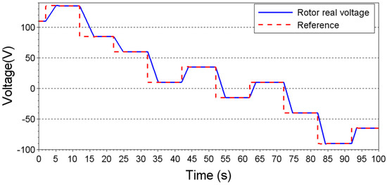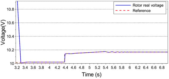 Having all the data, the system of equations has a simple solution obtained analytically by solving the system defined in Equation (38) (e.g., by variable elimination), thus finding the desired values. Observe that the equation has a degree of 2, which results in two solutions. The choice of the appropriate solution is done by analyzing the magnitude of the current corresponding to each of these solutions. The value of the current is calculated by Equation (19), and the solution chosen will correspond to a current smaller than the magnitude of the DFIG rotor-rated current. The solution [,] is found considering . As shown in the system proposed by Figure 1, the voltage has a nonzero phase angle, so it is necessary that the actual value of its angle be compensated at the end of the process of calculating the rotor voltage reference values. In the simulations, the stator voltage angle was obtained by the solution of the Thevenin equivalent circuit, but in practice, as it is not possible to know the equivalent of Thevenin at all times, it is necessary to use a Phase-Locked Loop (PLL) algorithm.