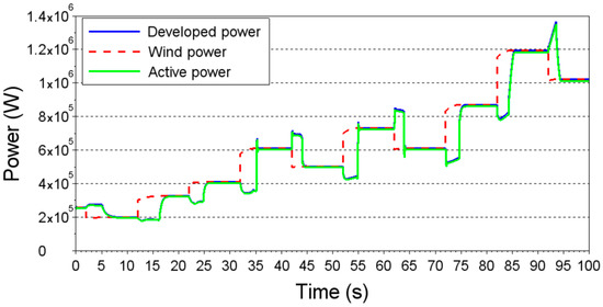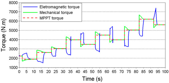 To verify the effectiveness of the proposed strategy at steady state, the developed, active and wind powers were analyzed. The behavior of the torques directly influenced the active power output, as can be analyzed from Figure 9.