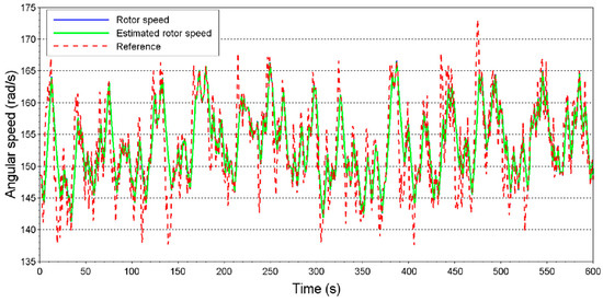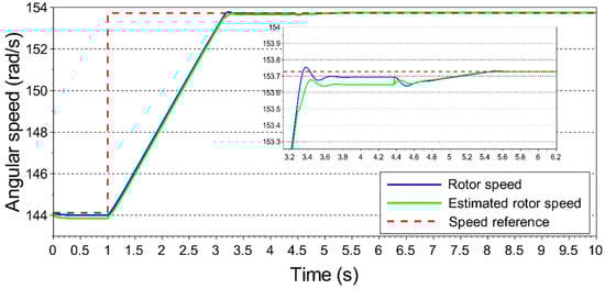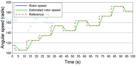 For the effect of the distance between the torques, the DFIG rotor accelerated or deaccelerated to reach the speed corresponding to the maximum power extraction point operation. Figure 9 shows the rotor speed behavior and its convergence to the reference values. The value of the estimated rotor speed was accurate, and the difference between both curves can hardly be observed in Figure 8.