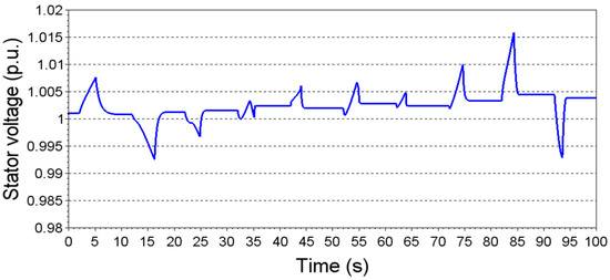 Since there was no voltage control, transient reactive power variations caused variations in stator voltage. Despite the reactive power peaks, the stator voltage remained within the limits imposed by the international grid codes, transiently [33], as shown in Figure 11.