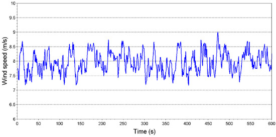 In order to test the proposed control in situations near to real conditions, a set of real measurement data of wind speed in a real farm was obtained. A selected range of 10 min, characterized by the mean value and standard deviation, was used to compose 600 points following a normal distribution. This variation is presented in Figure 17.