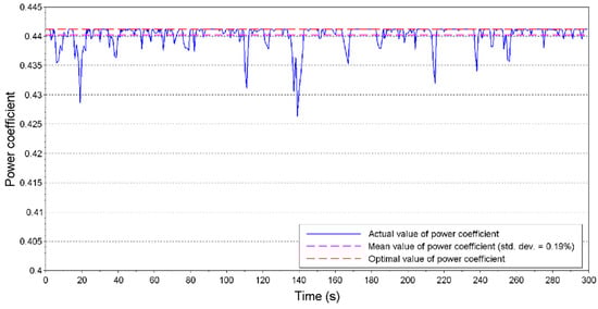 In order to give another idea about the efficiency of the proposed control strategy, the variation of the power coefficient with time is sketched in Figure 19. In this figure, a comparison between the optimal value, the mean value and the actual value of the power coefficient was registered for a time period of 300 s. The mean value corresponded to 99.77% of the optimal value, with a standard deviation of 0.19%.