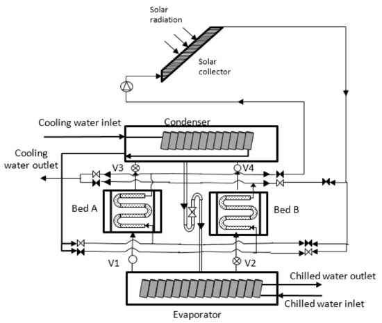 Water evaporates from the evaporator and is adsorbed by the adsorber through valve V1, which is called the “evaporator-adsorption process”. At the same time, desorbed water vapor flows to the condenser through valve V4, which is known as the “desorption-condensation process”. The adsorption cooling chiller used in this study is a conventional two-bed silica gel-water adsorption system proposed by Alam et al. [26] and the detailed operational procedure of the adsorption chiller system was presented in the literature [26].