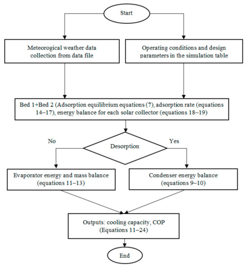 The above differential equations are solved using implicit finite difference approximation with a tolerance of 10−4 for the convergence calculation. Details of the simulation procedure were discussed in our previous publication [7]. The flow chart of a solar-driven two-bed adsorption chiller model was demonstrated in Figure 2. Table 1 lists the operating conditions and design parameters used in the present simulation. The assumptions include: (i) the temperature and pressure are uniform in each adsorber; (ii) no heat loss to the environment as the system is well insulated; (iii) the thermal energy transfer along the pipes connecting the system components is neglected; and (iv) the pressure differences between the sorption bed and the condenser or between the sorption bed and the evaporator are neglected [29].