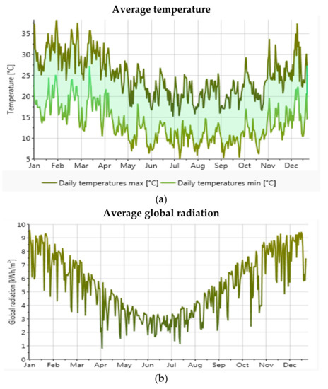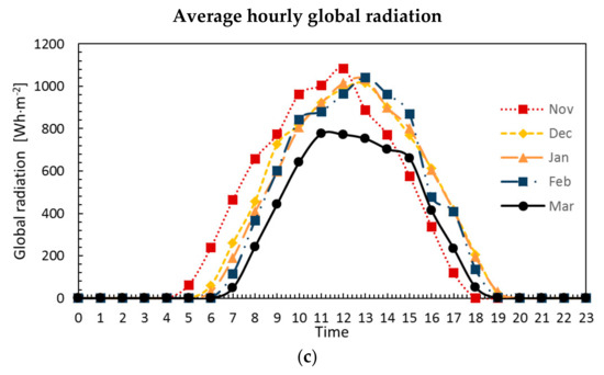 Average variation of ambient temperature and global radiation in Perth (Average temperature (a); Average global radiation (b); Average hourly global radiation (c).