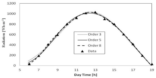 Figure 4 demonstrates the simulated global radiation for a typical day in January in Perth city using different orders of Fourier series. The results show that radiation intensity increases very quickly during the daytime from 400 W·m−2 at 8:00 am to 1020 W·m−2 at 13:00, and then gradually drops to 400 W·m−2 at 17:00, which matches very well with the ambient air temperature in Perth whenever the daytime temperature is very high and cooling is required. The highest global radiation is achieved at midday (13:00) with a radiation intensity of 1020 W·m−2. Comparison between the fitted and actual average hourly global solar radiation shows that the order of the Fourier series function does not have a strong impact on curve fitting for global radiation data. Three orders of the Fourier series function are sufficient to accurately match the actual radiation data.