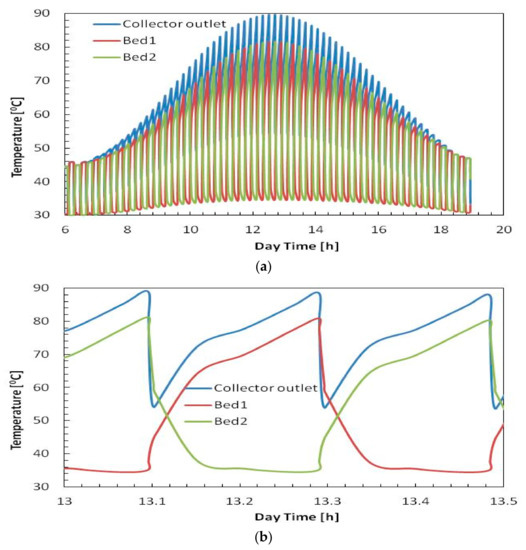 Figure 5 shows temperature profiles for hot water at the outlet of solar collectors and beds. The cycle time is 1500 s, and the total number of solar collectors is 15. It was observed that the water temperature at the collector outlet reached up to 90 °C while the water temperature at the bed outlet reached up to 80 °C. The temperature profiles show that the temperature of the hot water at the solar collector outlet (e.g., desorption bed inlet) stays above 60 °C between 9:00 and 17:00. This indicates that the adsorption chiller can be driven by the solar collector and provide cooling for most of the daytime. Figure 5b shows the temperatures at the hot water outlet of the solar collectors and sorption beds during a peak hour. The results show that the water temperature at the collector outlet is even above 80 °C which can effectively drive the adsorption chiller.
