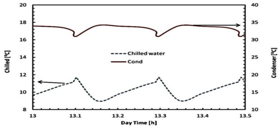Figure 6 shows water temperature profiles at evaporator and condenser outlets in the solar-driven two-bed adsorption chiller for a typical day in January in Perth city between 13:00 and 14:00. The water temperature trends agree well with the conventional adsorption chiller [10,36]. The water temperatures at the outlets of the adsorption beds, evaporator and condenser are normally applied to characterize the adsorption/desorption behavior. During the cooling process, the chilled water outlet temperature drops quickly at the beginning of the adsorption process because the adsorber is empty and the adsorption rate is high. As the vapor is adsorbed by the adsorbent (silica gel) in the adsorber, the adsorption rate decreases and hence the falling temperature rate at the chilled water outlet generally slowed down. Therefore, the drop in the chilled water outlet temperature slows down. When the adsorber is saturated, it enters the switching process after which the adsorber is switched to the desorption stage, and the empty desorption bed is switched to the adsorption stage to provide cooling. The next adsorption process starts in the empty adsorber. The chilled water outlet temperature varies between 9 and 12 °C while the condenser water outlet temperature varies between 30 and 34 °C. To achieve high system performance, the long cycle time is recommended to improve the adsorption/desorption process.