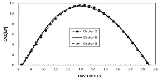Figure 7 shows the effect of the Fourier series order on the analytical evaluation of the cyclic average cooling capacity. As discussed in the radiation intensity section, the order of the Fourier series function did not have a significant effect on the cyclic cooling capacity. The average cooling capacity at peak time (13:00) was around 11.5 kW. The average cooling capacity over the daytime from 9:00 to 17:00 was around 9.2 kW which is high enough to cool a residential building with 100–120 m2 floor area. Furthermore, high cooling capacity corresponds to high ambient temperature, which makes the solar adsorption chiller a perfect match to the cooling needs.