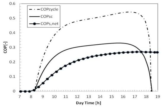 The cycle COP is defined as a ratio of cooling capacity to total required thermal energy and is calculated for each single cycle; while the solar system COP in a cycle (COPSC, cycle) is defined as a ratio of cooling capacity to the net solar energy input; and COPSC, net is calculated on the period of cold production. These COPs are calculated as [24,27]: