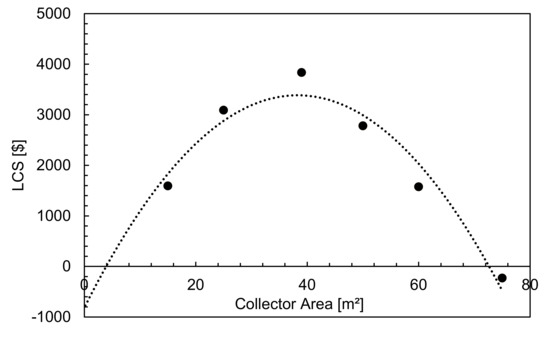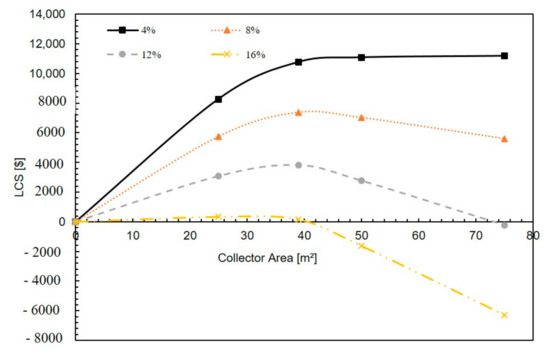 Figure 12 shows the effect of interest rate on the LCS. The results showed that investment in the solar adsorption cooling system is feasible for a collector area of 38 m2 even if the interest rate is as high as 16%. The results also show that the optimal collector area is around 38 m2 for all studied interest rates ranging from 4% to 16%. This is consistent with the results shown in Figure 9 and Figure 10.