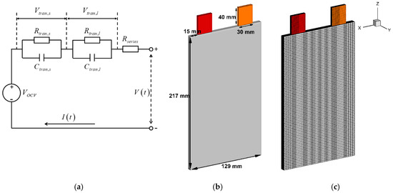 The difficulty of lithium-ion battery modeling comes from its enrollment of multi-scale and multi-physics. A multi-scale multi-domain lithium-ion battery modeling framework is adopted for the present study. For the subscale model, the ECM approach is used. In the ECM approach, the behavior of a lithium-ion battery is represented by an electrical circuit, as shown in Figure 1a. The ECM approach has been demonstrated to be an effective method to model the subscale electrochemical characteristics of lithium-ion batteries with accuracy and robustness [40]. The schematics of geometry and mesh for the lithium-ion battery thermal modeling are shown in Figure 1b,c. Except for the scales shown in Figure 1, the thickness of the battery cell is 7.2 mm while the thickness of the tab area is assumed to be 4.32 mm. The geometry is set up based on an EiG ePLB C020 lithium-ion polymer battery. The ePLB C020 is a high energy-density lithium-ion battery based on Li[NiCoMn]O2 cathode and graphite anodes. It has a format of prismatic, nominal voltage of 3.65 V, and nominal capacity of 20 Ah. More specifications of ePLB C020 lithium-ion polymer battery can be found in ref [41]. The mathematical formulation of the ECM approach is:
