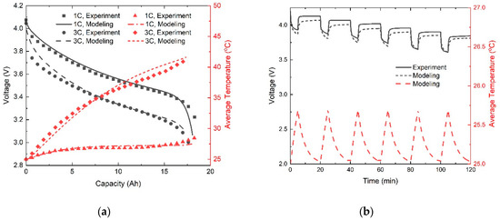With these parameters, the modeling results match well with the experimental results [42] of the I-V curve and thermal responses in Figure 2a. In addition, the time variation in the current is tested by another simulation with a pulse waveform of current discharging condition used in reference [43]. In reference [43], the ePLB C020 cell was tested by a protocol that subjects the cell under 15 A pulse discharging for 5 min, and then rests the cell by 15 min before the next discharging period. Then, the simulation results are compared with the experimental results of the cell voltage in Figure 2b to further demonstrate the validity of the present model. The time step for the simulation has been found to be fine enough to capture the battery behavior under such a test protocol. It can be seen in Figure 2b that the modeling results have some differences to the experimental results. As the modeling parameters are fitted from experimental data [42], the predicted voltage does not match perfectly with the experimental results in Figure 2b. If the two experimental datasets are directly compared, they show some slight differences. The differences may come from different experimental conditions and experimental measurement instrumentation. Although all the data are collected from an EiG ePLB C020 lithium-ion polymer battery, the differences between different experiments may come from different contact resistances, different state of aging for tested battery, or from the batch-to-batch battery difference. However, the Figure 2b indicates that the present model captures well the trend of voltage response under pulse wave load condition indeed, which is meaningful. It is also worthwhile mentioning that the predicted average temperature in the battery cell is not compared with experimental data in Figure 2b as the temperature responses are not measured in reference [43]. The predicted temperature is intended to show the battery thermal model behavior under dynamic load condition instead of further validating the battery thermal model. At the lithium-ion battery-cell scale, the electrical equations and thermal equation are solved for the electrical and thermal fields: