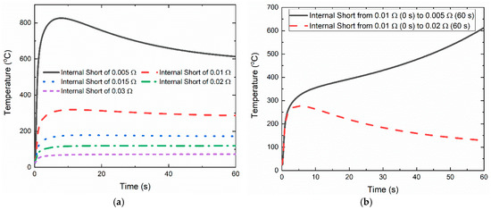 The thermal responses of a lithium-ion battery in the internal shorting process is affected largely by the shorting resistance, as implied by the analysis implied in Equation (17). Different shorting resistances in the range of 0.005 Ω to 0.03 Ω are subjected to simulations to provide a trend analysis of the shorting resistance effects on the internal shorting process. Such a study aims to help point out that internal shorting can be extremely harmful for a small shorting resistance, while the internal shorting is not that harmful with a resistance larger than a certain value. A basis of the assumption comes from reference [37], which estimates the internal shorting resistance to be about 0.005 Ω (5.3 m Ω). This supports the assumption of shorting resistance range chosen in this study. The modeling predicted temperature evolutions are shown in Figure 5a. It is seen that internal short resistance has a dominating effect for the temperature response. Shorting resistances of 0.005 Ω and 0.01 Ω can cause the maximum cell temperature to reach 800 °C and 300 °C within 10 s. Such a high temperature will trigger aggressive further thermal runaway. As the temperature above 100 °C can already initiate thermal runaway, the shorting resistance of 0.015 Ω and 0.02 Ω can also cause further thermal runaway as indicated in this study. On the other hand, for the internal short resistance of 0.03 Ω, the temperature responses for the lithium-ion battery cell is more like the normal discharging condition which will not trigger thermal runaway. It is found that the thermal behaviors of a lithium-ion battery cell are very sensitive to the quantity of shorting resistance. In addition, the shorting resistance may actually vary with time due to the temperature variation. It is hard indeed to estimate how the shorting resistance changes with time. For a preliminary study on the resistance variation’s effect on internal shorting, two more cases are performed assuming linear changing of the shorting resistance from 0.01 Ω to 0.005 Ω, or 0.02 Ω within a period of 60 s. The temperature response is shown in Figure 5b. Those simulations give the demonstration for the incorporation of the resistance variation. However, further effort is still needed to establish the internal shorting resistance correlation with temperature.