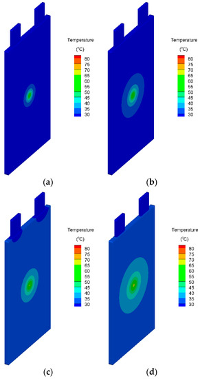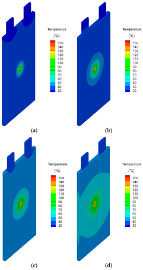 Figure 12 shows the temperature distribution evolutions for the lithium-ion battery cooled by a mini-channel cold plate undergoing the internal shorting process. The temperature contour is significantly governed by the internal shorting and it is hard to distinguish the coolant inlet to outlet direction temperature non-uniformity in Figure 12. This is because the internal shorting process creates a large temperature non-uniformity, which is much larger than the coolant inlet to outlet temperature non-uniformity. In comparison with Figure 6, the high temperature region above 100 °C in Figure 12 has a smaller area compared with the case of air cooling. The temperature above 100 °C will cause dangerous situations for triggering further lithium-ion battery thermal runaway. From this point of view, the mini-channel cold plate has advantage of better suppressing the area of high temperature region in the internal shorting process. The underlying reason is that the mini-channel cold plate employs an aluminum metal plate, which acts as a large heat spreader under the internal shorting condition. The aluminum metal plate helps to enhance the in-plane spreading of heat, thus helping to limit the high-temperature area.