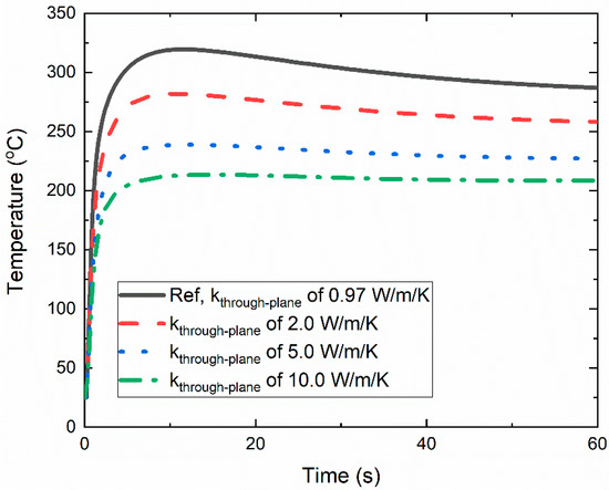 Modeling predicted maximum temperature on lithium-ion battery cell with different through-plane thermal conductivities.