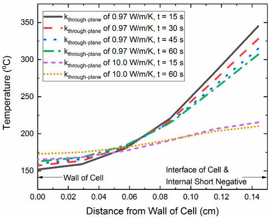 The reason for such large impacts can be explained with Figure 9, which shows the through-plane temperature distributions from the internal short and cell interface to the lithium-ion battery cell wall. It is seen that the low through-plane thermal conductivity of 0.97 W/m/K results in a steeper through-plane temperature distribution. The temperature distribution is caused by large conduction heat resistance in the through-plane direction; while for the through-plane thermal conductivity of 10.0 W/m/K, this resistance is significantly lowered, as observed in Figure 9. The modeling work implies that even with a very high convective heat transfer coefficient achieved on the lithium-ion battery cell surface, the internal temperature of a lithium-ion battery cell can still be high. The large amount of heat generated form the internal short cannot be easily conducted out to the surface. The temperature rise inside the lithium-ion battery cell near the internal short will still trigger thermal runaway. This means that except for the external cooling design, the internal mechanisms and internal suppression of the temperature rise have significant importance in mitigation of the internal shorting induced thermal runaway.