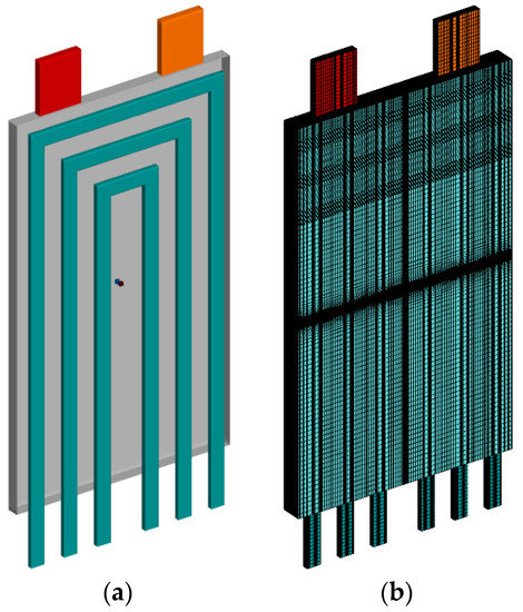 Schematic of (a) geometry; (b) mesh for internal shorting modeling of lithium-ion battery cooled by mini-channel cold plate.