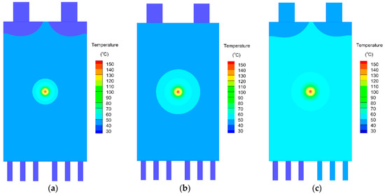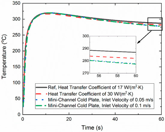 It is seen in Figure 11 that the temperature evolutions are quite similar under different cooling conditions. Raising the convective heat-transfer coefficient from 17 W/(m2·K) to 30 W/(m2·K) helps to slightly reduce the maximum temperature on lithium-ion battery cell. Then, applying the mini-channel cold plate further brings down the maximum temperature in the cell. However, the difference in the maximum temperature in the cell is quite small, especially with respect to the change of mini-channel coolant velocity. The small effect of the mini-channel coolant velocity is firstly because the heat-transfer coefficient provided by the mini-channel is limited. In addition, the temperature rise of the coolant from the inlet to the outlet is not big, especially compared with the maximum cell temperature of above 300 °C. Thus, unlike the situation under a fast discharging or external shorting condition where mini-channel flow rate has a large effect on lowering the cell temperature [17], the mini-channel flow rate does not succeed in reducing the cell temperature in the internal shorting process. Actually, the cooling solutions including enhancing the heat-transfer coefficient or adopting cold-plate cooling do not have large effects on alleviating the high temperature inside the lithium-ion battery cell. The conductive thermal resistance dominates the thermal behaviors of the internal shorting process, instead of the external cooling conditions.