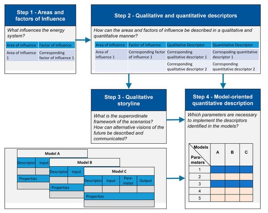 In the following subsections, we outline our method of developing scenarios that address the outlined challenges. It consists of a step-by-step approach that is generic and suitable for various applications. The approach is described schematically in Figure 1. Following the identification of the areas and factors of influence (Step 1), qualitative and quantitative descriptors are determined (Step 2). These serve as the basis for developing a qualitative storyline (Step 3) and quantifying the scenario parameters in coordination with the models’ characteristics (Step 4).