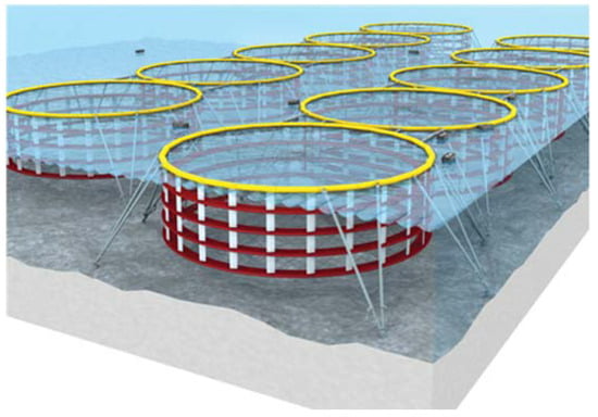 Figure 1 shows a group of close-packed contra-rotating vertical-axis rotors, designed by Stephen Salter to maximise the fraction of flow passage swept []. Blockage is estimated to increase to given the small gaps between the rotors, which are controlled by a hydraulic ram. The rotor diameter should be at least three times the water depth in order to provide stability in pitch and roll of a single rotor, and this should be doubled for a close-packed array. This contributes to a high blockage fraction allowing generation well above the Betz limit for rotors in channels []. Following Buntine and Pullin [], the design concept is based on two vortices of opposite-sign cancelling each other out, and thus conditioning the flow though the turbine while lowering the turbulence kinetic energy in the wake. The turbine downstream area will then experience less stream-wise flow variation, reducing mixing loss and therefore enhancing energy extraction. To predict the commercial feasibility of this large-scale marine hydrokinetic application, a numerical model of such devices is required.