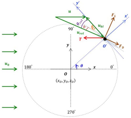 To calculate the body forces, the coordinates of nodes in the mesh are first translated to the frame of reference of the rotor, in a similar manner to the original WATTES model []. The centre of the vertical-axis turbine is located at position (see Figure 2), where . The azimuthal angle, which describes the orbital path taken by the first turbine blade, is denoted . In WATTES-V, starts from the -axis, as indicated in Figure 2. The coordinates of a blade reference frame are denoted , , , with the origin of the new reference system. In the blade reference frame, the coordinates of a transformed point at position are: